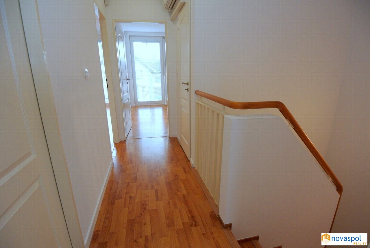 V přízemí obývací pokoj s francouzskými okny na zahradu, kuchyňská linka se spotřebiči (varná deska, horkovzdušná trouba, myčka, lednice), koupelna se sprchovým koutem + WC, pračka, chodba s vestavěnými skříněmi. V patře 3 pokoje. Ze 2 vstup na balkon. Koupelna s vanou + WC, sušička. Komora. Podlah...